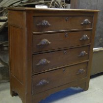 Chest of drawers, four drawers with carved walnut pulls, made from walnut, pine and popular woods. From the home of Howard Kline, Spring Creek, Virginia, probably originally in his home place on Linville Creek in Rockingham County. Label reads: "From T. P. Humphrey, Steam Furniture Works, Bridgewater, Virginia, c. 1885. 44 3/4" (h) x 41 3/4" (w) x 18" (d). |